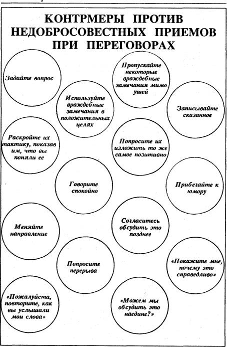 18. Люди не всегда придерживаются правил порядочности при переговорах. Они могут не дать вам возможности высказаться, грубить вам, игнорировать вас, пользоваться отвлекающими приемами или выдвигать чрезмерные требования. Взгляните на диаграмму, на которой перечислены некоторые контрмеры, применяемые для разрешения конфликтов в таких случаях: